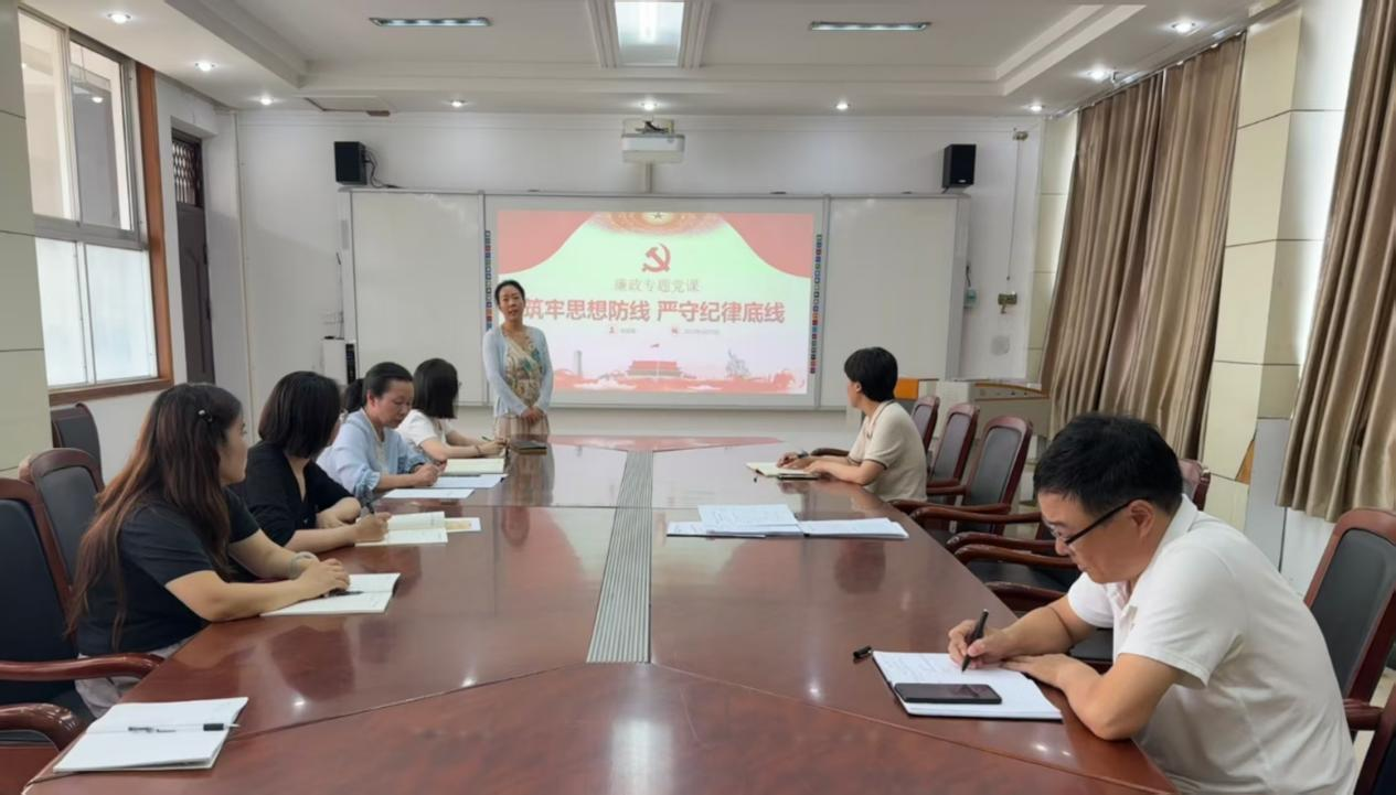 6月13日,z6mg人生就是博直属党支部书记杨聪聪以《筑牢思想防线 严守纪律底线》为题在二楼会议室为全体教职工党员讲授廉政党课。